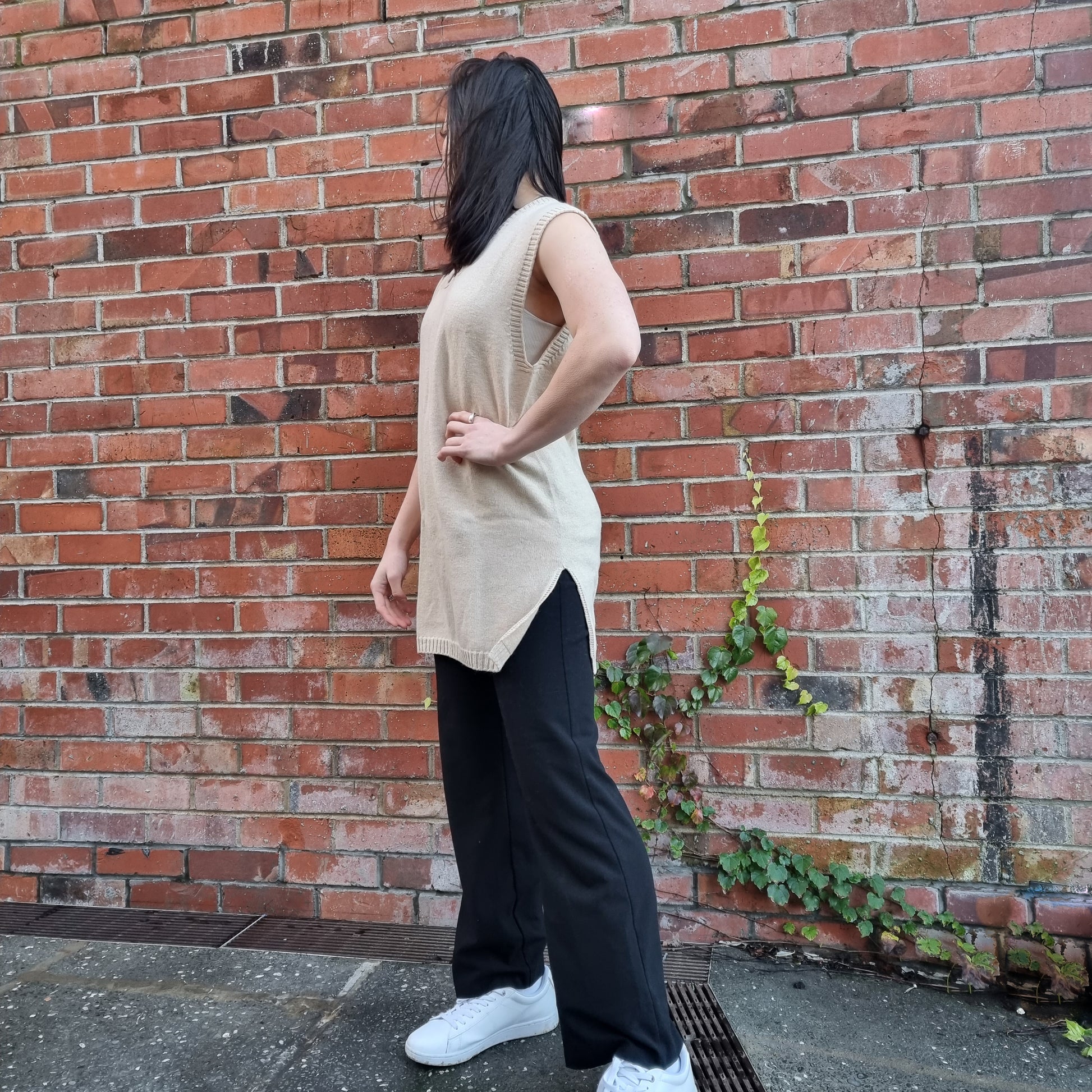 Wear this piece on its own or layer for that extra cosy feeling. Sleeveless, low cut armholes make it a the perfect piece to easily combine with your favourite long sleeve or tee. Cinch with a belt or wear as is for ultimate comfort.